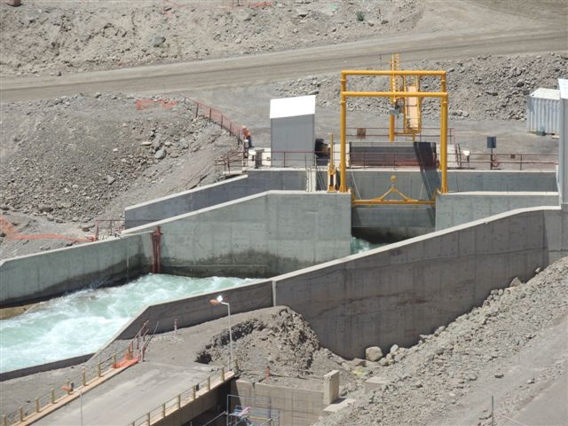 The first issue to be resolved was the construction of the sluice gate, a 60-meter high inclined reinforced concrete tower supported by rock with three internal pipes, each housing a gate, cofferdam and ventilation system. A self-climbing core wall system was designed on site with a stripping system using scissor-type support arms.